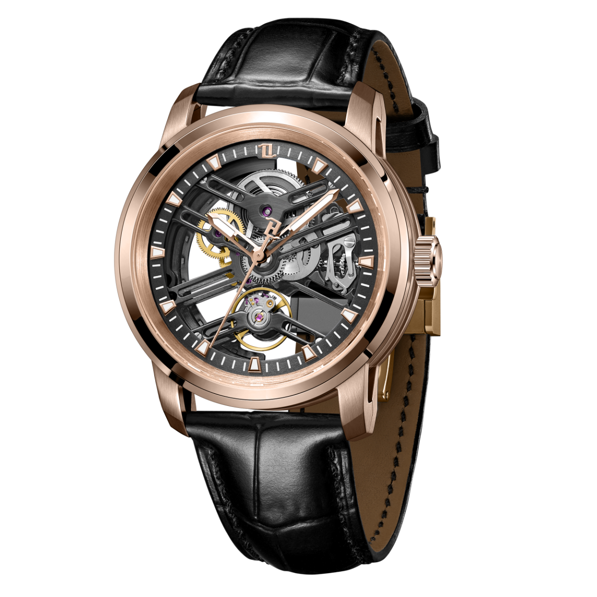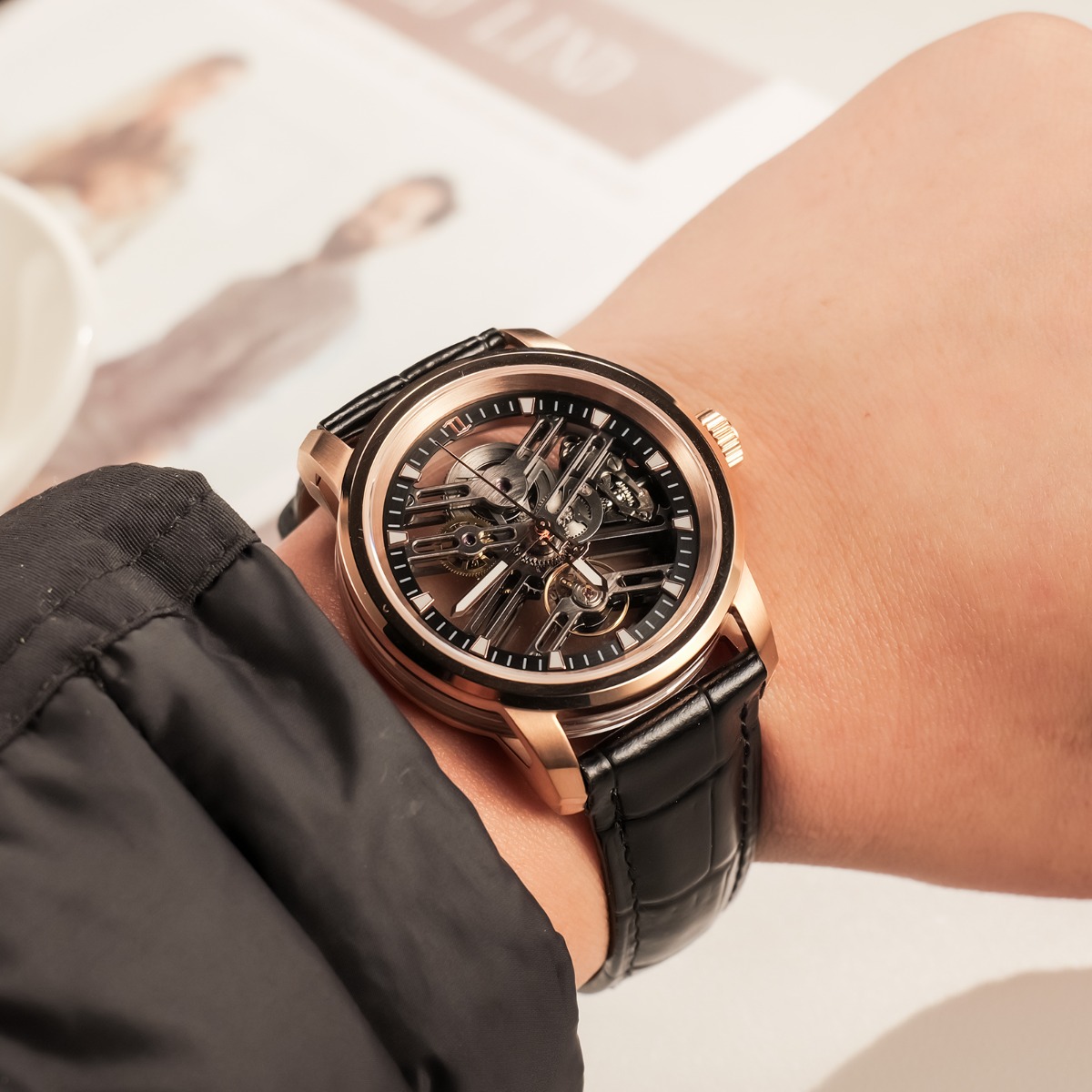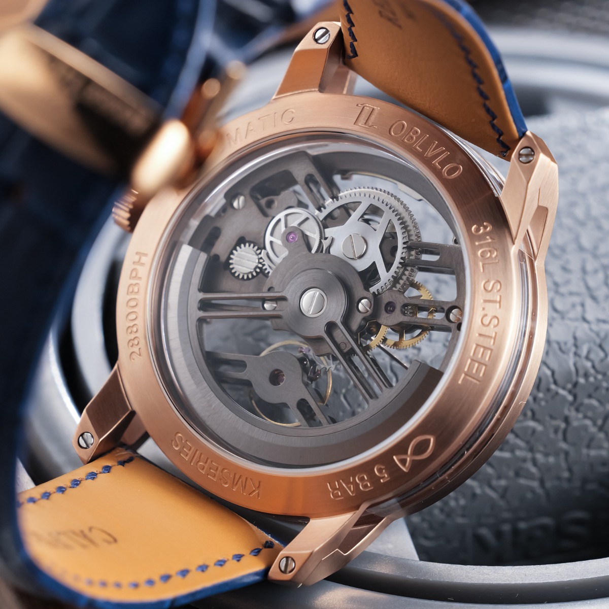 OBLVLO|玫瑰金框 鏤空機械腕錶 黑色皮革錶帶 男錶 OBL-KM-PBBL