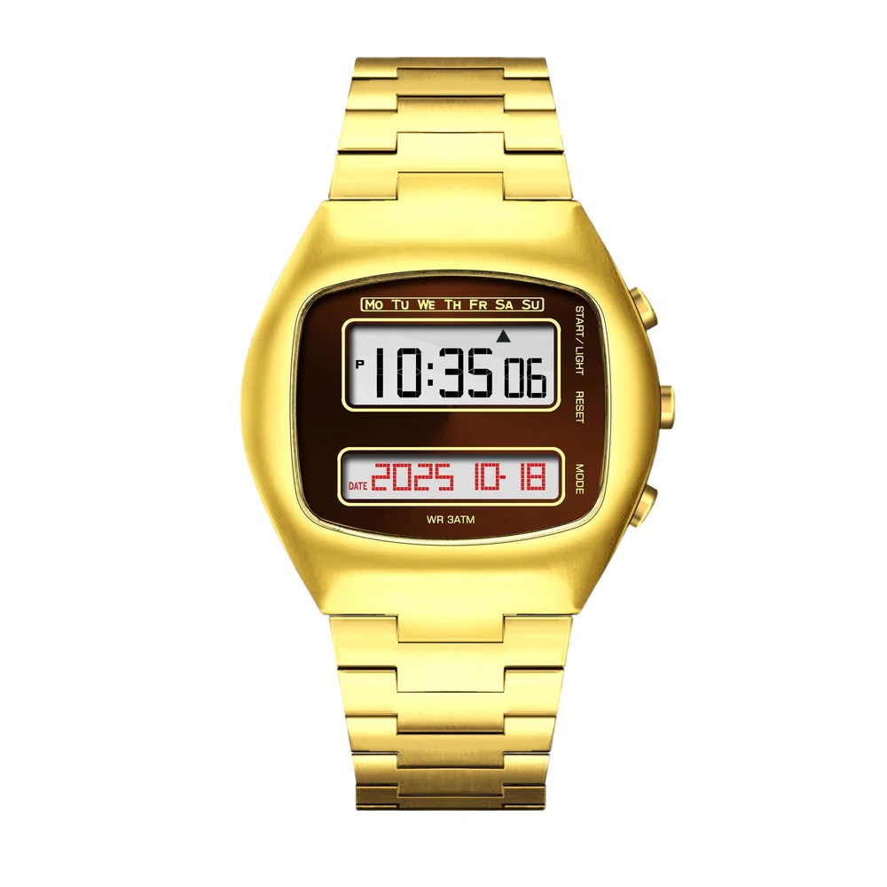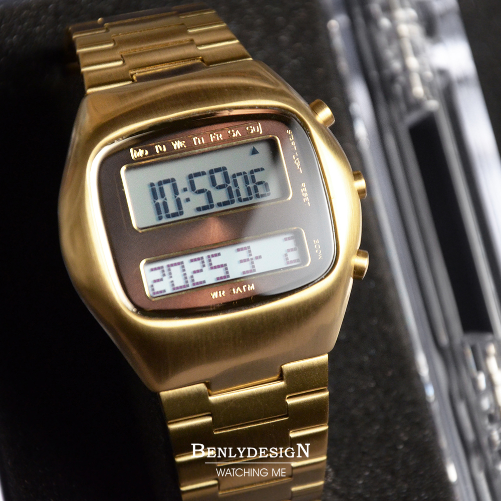 Benlydesign |TV型 金色款 復古電視造型 LCD顯示 多功能 不鏽鋼錶帶 電子錶(TV-G)